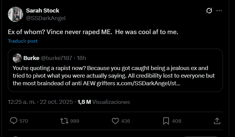 Las calenturas en X porque a un luchador o ex luchador no le gustó un combate, son cosas de todos los días. El tema con Sarah, es que luego de que sus discusiones prosiguieran, terminó dando una opinión increíblemente incendiaria sobre Vince McMahon, el ex dueño de WWE que está acusado de abuso, tráfico y explotación sexual:
