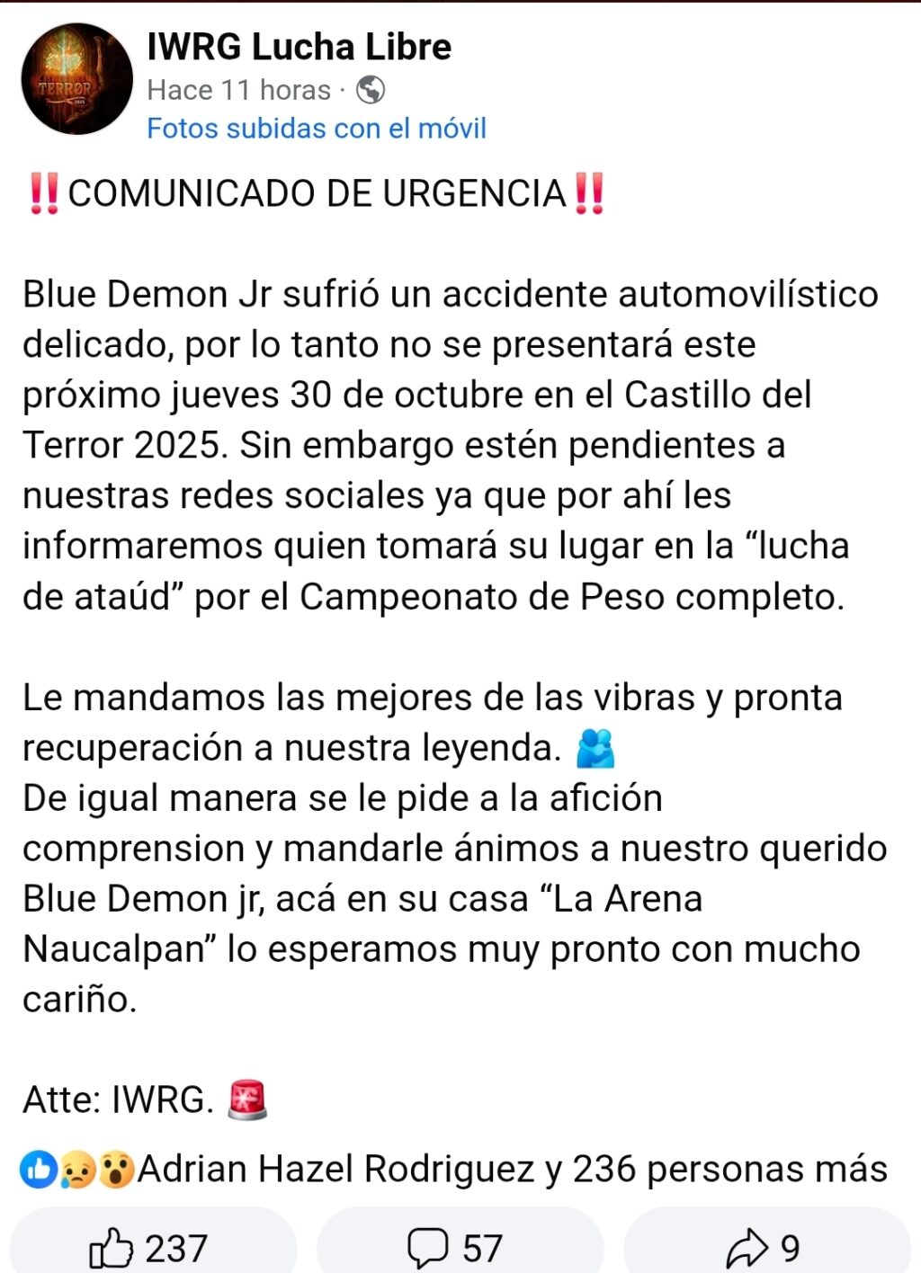 Durante el día de ayer, la empresa mexicana IWGR informó en su Facebook que no podrían contar con Blue Demon Jr. para un show del 30 de octubre. La razón: un accidente automovilístico.